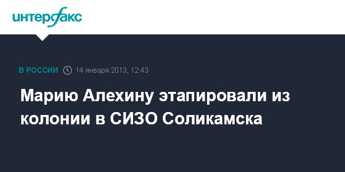 Пермь. 14 января. INTERFAX.RU - Осужденная участница Pussy Riot Мария Алехина находится в СИЗО города Соликамска в Пермском крае, сообщил в понедельник "Интерфаксу" муж еще одной осужденной девушки из группы Надежды Толоконниковой Петр Верзилов.