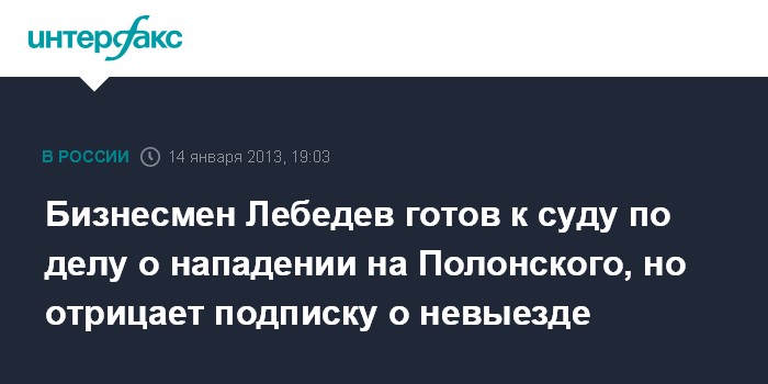 Бизнесмен Лебедев готов к суду по делу о нападении на Полонского, но отрицает подписку о невыезде