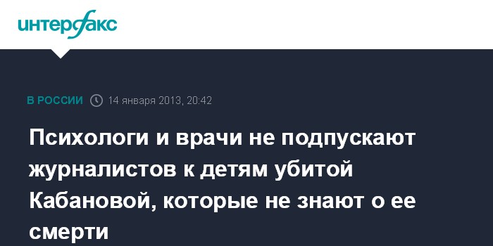 Москва. 14 января. INTERFAX.RU - Дети убитой журналистки Ирины Кабановой пока не знают о том, что их матери нет в живых, сообщила глава пресс-службы департамента здравоохранения столицы Элина Николаева.