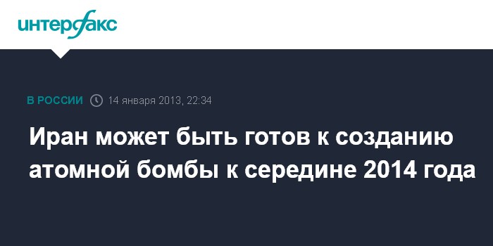 Вашингтон. 14 января. INTERFAX.RU - Исламская республика Иран может произвести достаточное количество оружейного урана для создания атомной бомбы к середине 2014 года, говорится в опубликованном в понедельник докладе группы экспертов США по вопросам нераспространения ядерного оружия.