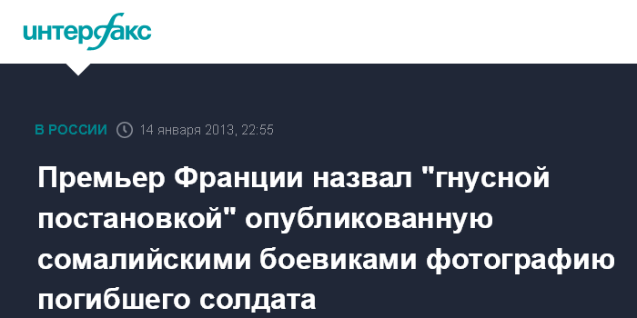 Париж. 14 января. INTERFAX.RU - Глава правительства Франции Жан-Марк Эйро выразил возмущение публикацией боевиками сомалийской группировки "Аш-Шабаб" фотографии скончавшегося французского солдата. "Это особенно гнусная постановка", - заявил он журналистам в понедельник.