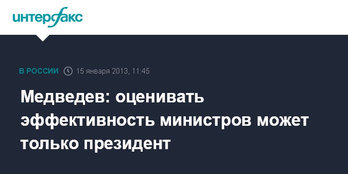 "По мнению Медведева, единственным человеком, который может оценивать эффективность деятельности отдельных министров и правительства может быть только президент", - заявила журналистам пресс-секретарь главы правительства Наталья Тимакова, комментируя статью в газете "Известия" со ссылками на неназванных сотрудников администрации президента и экспертов, составляющих рейтинги эффективности министров.