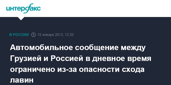 Тбилиси. 15 января. INTERFAX.RU - Движение всех видов автотранспорта на прилегающем к России участке Гудаури-Коби Военно-Грузинской дороги по-прежнему запрещено c 12:00 до 17:00 вторника из-за опасности схода снежных лавин, сообщили "Интерфаксу" в департаменте автомобильных дорог Грузии.