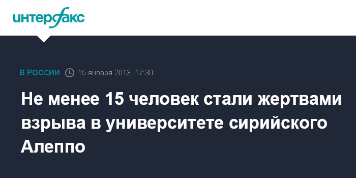 Лондон. 15 января. INTERFAX.RU - По меньшей мере, 15 человек были убиты и еще десятки получили ранения в результате взрыва, прогремевшего в ведущем университете в городе Алеппо на севере Сирии, сообщает во вторник базирующийся в Лондоне Наблюдательный совет по правам человека в Сирии.