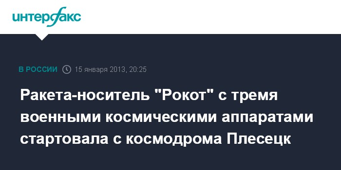 Плесецк (Архангельская область). 15 января. INTERFAX.RU - Россия открыла во вторник космический 2013 г. запуском с космодрома Плесецк ракеты-носителя "Рокот" с тремя военными космическими аппаратами.