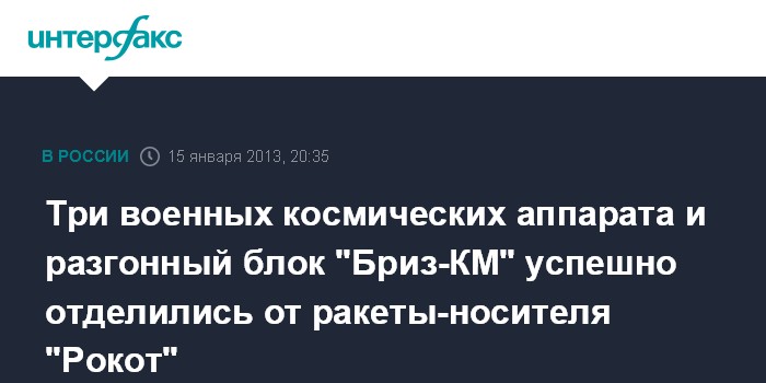 Плесецк (Архангельская область). 15 января. INTERFAX.RU - Ракета-носитель "Рокот", стартовавшая во вторник с космодрома Плесецк, успешно вывела на низкую суборбитальную траекторию орбитальный блок в составе трех военных космических аппаратов и разгонного блока "Бриз-КМ", сообщил во вторник "Интерфаксу-АВН" официальный представитель Войск воздушно-космической обороны (ВВКО) полковник Алексей Золотухин.