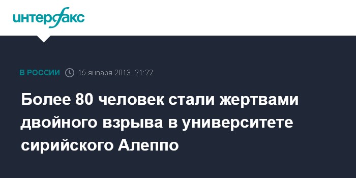 Бейрут. 15 января. INTERFAX.RU - Двойной взрыв в ведущем университете в городе Алеппо на севере Сирии привел к гибели более 80 человек, заявил журналистам мэр города Мухаммед Вахид Аккад.