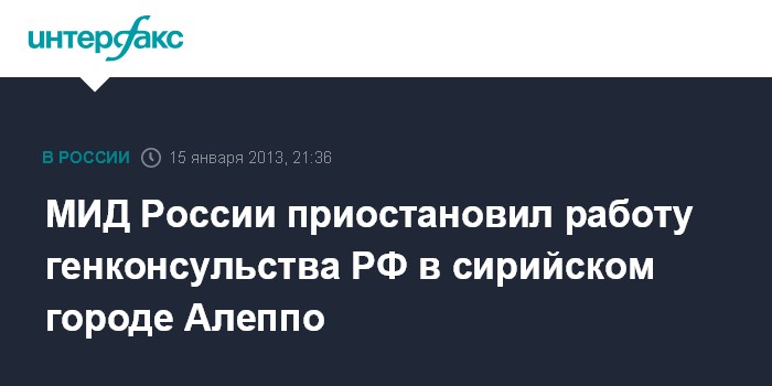 Москва. 15 января. INTERFAX.RU - МИД России информирует о приостановке деятельности Генконсульства во втором по величине городе Сирии - Алеппо (Халебе).