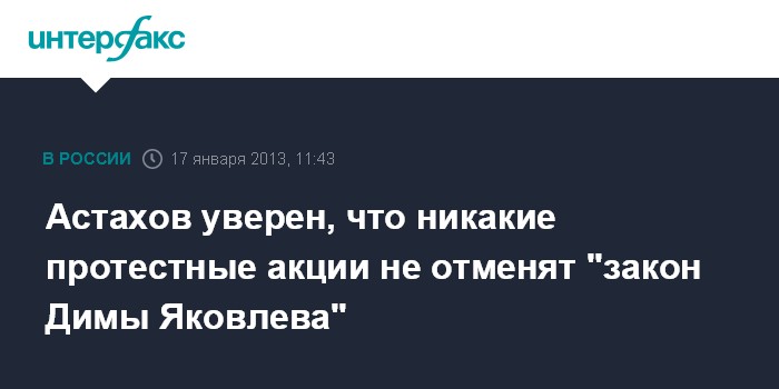 Москва. 17 января. INTERFAX.RU - "Закон Димы Яковлева" не подлежит отмене, какая бы критика не была, пути назад нет, заявил уполномоченный по правам ребенка при президенте РФ Павел Астахов.