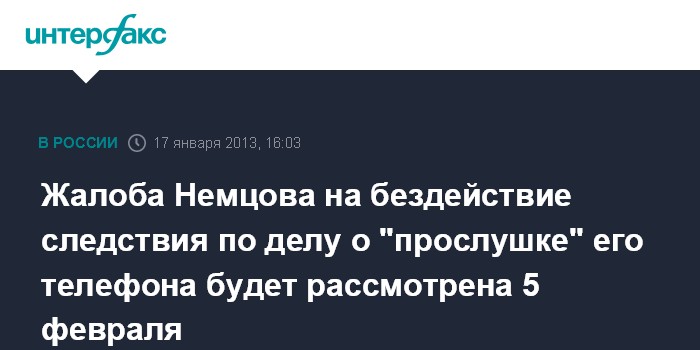 Немцов в своей жалобе заявил о незаконности отказа возбудить уголовное дело по ст.137 УК РФ (нарушение неприкосновенности частной жизни) и невыдачи ему постановления о признании его потерпевшим по уголовному делу по ст.138 УК РФ (нарушение тайны переговоров).