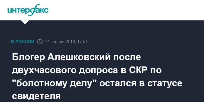 Москва. 17 января. INTERFAX.RU - Журналист и блогер Дмитрий (Митя) Алешковский покинул здание Следственного комитета РФ после допроса по делу о беспорядках на Болотной площади 6 мая в статусе свидетеля, с него взята подписка о неразглашении.