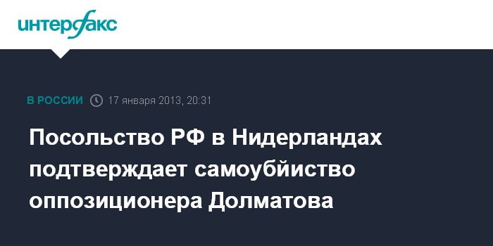 Гаага/Москва. 17 января. INTERFAX.RU - В российской дипмиссии в Нидерландах подтвердили, что в этой стране покончил с собой российский оппозиционер Александр Долматов.