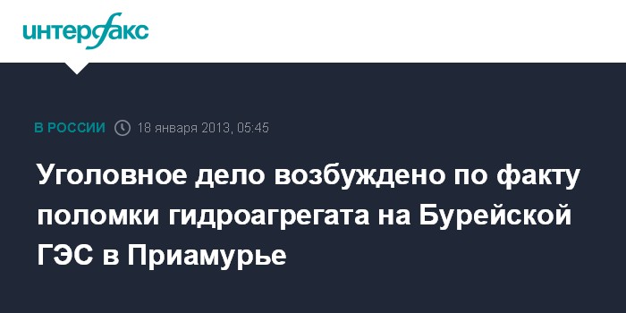 Владивосток. 18 января. ИНТЕРФАКС-ДАЛЬНИЙ ВОСТОК - Следственное управление УМВД по Амурской области возбудило уголовное дело по факту поломки гидроагрегата и последующей аварии на Бурейской ГЭС в сентябре 2012 года, сообщает в пятницу прокуратура региона.