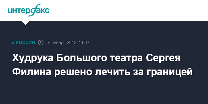 Москва. 18 января. INTERFAX.RU - Попечительский совет Большого театра принял решение о переводе художественного руководителя балетной труппы Сергея Филина в одну из зарубежных клиник, сообщил в пятницу "Интерфаксу" источник в театре.