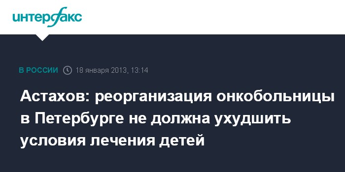 Москва. 18 января. INTERFAX.RU - Детский омбудсмен Павел Астахов призвал не допустить ухудшения условий лечения онкобольных детей в результате реорганизации 31-й больницы Петербурга, на базе которой действует единственное на Северо-Западе РФ детское онкологическое отделение.