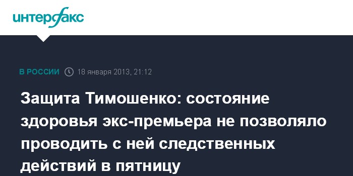 Харьков. 18 января. INTERFAX.RU- Состояние здоровья экс-премьера Юлии Тимошенко не позволяло проводить с ней следственные действия в пятницу, 18 января, утверждает защитник экс-премьера Сергей Власенко.
