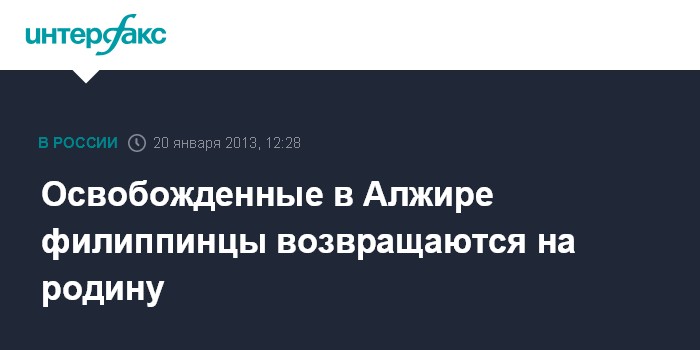 Джакарта. 20 января. INTERFAX.RU - Десятки филиппинцев возвращаются на родину после освобождения алжирскими военными из плена террористов на газовом объекте на юго-востоке Алжира, сообщил в воскресенье журналистам представитель МИД Филиппин Рауль Эрнандес. "Наши представители в Алжире предоставили данные о 52 (освобожденных - ИФ) филиппинцах", - сказал он.