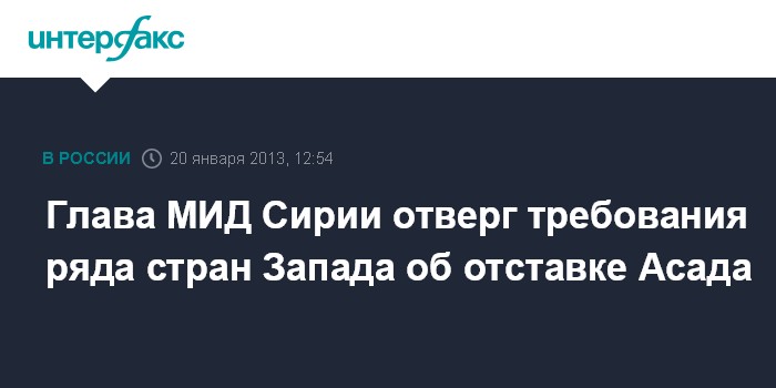 Бейрут. 20 января. INTERFAX.RU - Министр иностранных дел Сирии Валид аль-Муаллем отклонил требования ряда стран Запада об отставке президента страны Башара Асада, сообщает в воскресенье государственное сирийское телевидение. "США продолжают выдвигать условия смены правящего режима, предусматривающие отставку президента, игнорируя тот факт, что капитан потерпевшего крушение корабля первым не прыгает в шлюпку", - сказал он.
