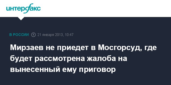 Мирзаев не приедет в Мосгорсуд, где будет рассмотрена жалоба на вынесенный ему приговор