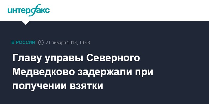 Москва. 21 января. INTERFAX.RU - Глава управы столичного района Северное Медведково задержан при получении 3,5 млн рублей в виде взятки, сообщили "Интерфаксу" в пресс-службе ГУ МВД России по Москве.