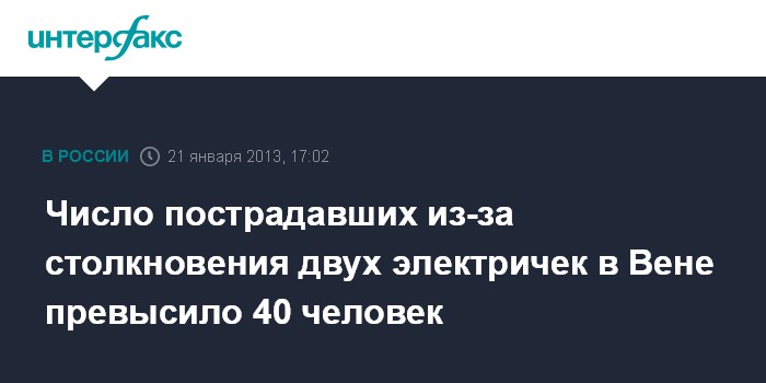 Лондон. 21 января. INTERFAX.RU - По меньшей мере, 41 человек получил травмы, и пятеро из них находятся в критическом состоянии в результате столкновения двух пассажирских поездов в час пик в австрийской столице Вене, сообщил в понедельник британский телеканал Sky News со ссылкой на представителя спасателей Рональда Пакерта.