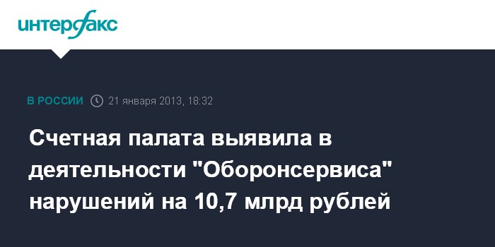 Москва. 21 января. INTERFAX.RU - Счетная палата (СП) РФ, проверяя деятельность ОАО "Оборонсервис" в 2009-2011 гг., выявила крупные нарушения.
