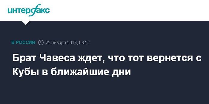 Лондон. 22 января. INTERFAX.RU - Президент Венесуэлы Уго Чавес должен вернуться с Кубы в ближайшие дни, заявил его брат Архенис Чавес.