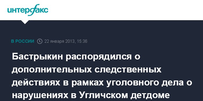 Москва. 22 января. INTERFAX.RU - Председатель Следственного комитета РФ Александр Бастрыкин поручил подчиненным провести дополнительный комплекс следственных мероприятий в рамках уголовного дела против руководителя Угличского детдома, которая обвиняется в халатности и злоупотреблениях полномочиями.