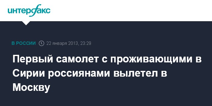 Москва. 22 января. INTERFAX.RU - Первый самолет МЧС РФ с вывезенными из Сирии через Ливан россиянами вылетел из Бейрута в Москву в 23:12, сообщили "Интерфаксу" в управлении информации МЧС РФ. "Самолет Як-42 вылетел из Бейрута в столичный аэропорт "Домодедово". На его борту россияне, пожелавшие покинуть Сирию", - отметили в МЧС.