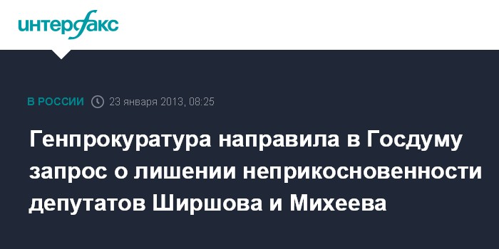 Москва. 23 января. INTERFAX.RU - Генеральная прокуратура РФ, ознакомившись с материалами дел депутатов от КПРФ Константина Ширшова и от "Справедливой России" Олега Михеева, пришла к заключению о необходимости привлечения их к уголовной ответственности, сообщают "Известия" в среду.