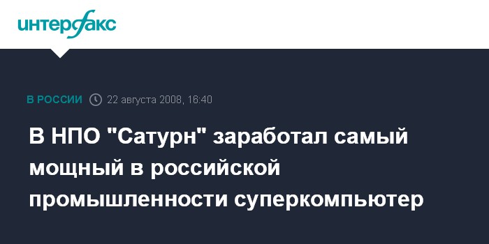 Москва. 22 августа. INTERFAX.RU - Самый мощный в промышленности России и СНГ суперкомпьютер, способный совершать 14 трлн операций в секунду и стоимостью 100 млн рублей, запущен в пятницу в эксплуатацию в Научно-производственном объединении "Сатурн". "Это в чистом виде инновационная экономика, о которой в последнее время так много говорят. Мы реализуем ее на практике", - сказал во время запуска суперкомпьютера гендиректор НПО "Сатурн" Юрий Ласточкин.