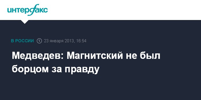 В интервью телекомпании Bloomberg в среду Медведев сказал, что Магнитский был корпоративным юристом или бухгалтером, отстаивал интересы людей, которые его наняли. Он добавил, что не считает погибшего юриста "борцом за правду", но главное - разобраться "в причинах его смерти в тюрьме".