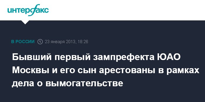 Москва. 23 января. INTERFAX.RU - Тверской суд Москвы арестовал бывшего первого заместителя префекта Южного административного округа столицы и его сына в рамках уголовного дела о вымогательстве крупной суммы денег у коммерсанта.