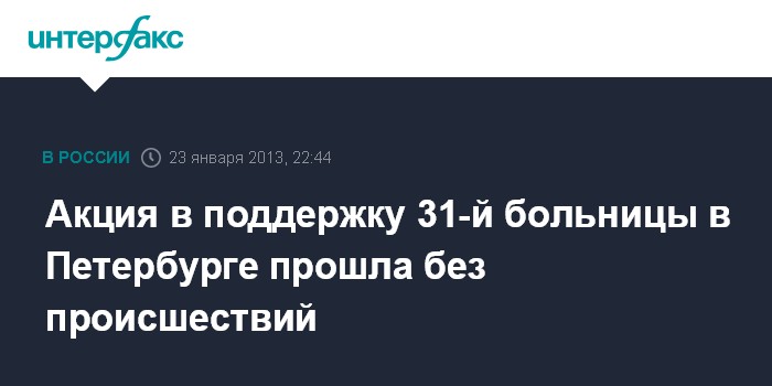 Санкт-Петербург. 23 января. INTERFAX.RU - Согласованная с властями города акция в защиту городской клинической больницы №31 в Петербурге прошла в среду без происшествий.