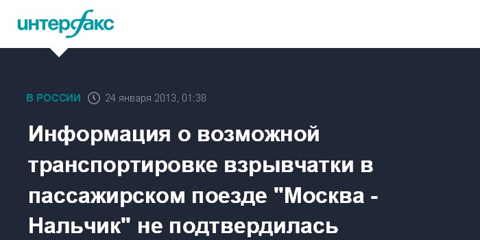 "Анонимный телефонный звонок о возможной транспортировке взрывчатки в пассажирском поезде "Москва-Нальчик" поступил вечером в среду", - сказал собеседник агентства