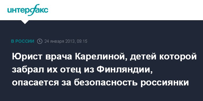 Петрозаводск. 24 января. INTERFAX.RU - Жительнице Петрозаводска Светлане Карелиной, двоих детей которой забрал и отказывается отдавать их отец - гражданин Финляндии, после пропажи документов из квартиры может угрожать опасность, считает представляющая интересы россиянки юрист Елена Ильина.