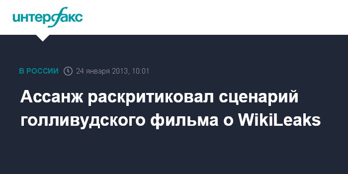 Лондон. 24 января. INTERFAX.RU - Основатель информаторского веб-сайта WikiLeaks Джулиан Ассанж подверг резкой критике сценарий посвященного его деятельности кинофильма "Пятая власть" (The Fifth Estate), который снимает киностудия DreamWorks.