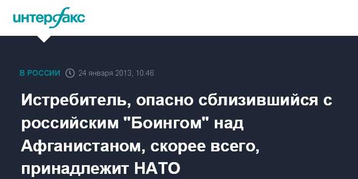 Москва. 24 января. INTERFAX.RU - Военный самолет, подошедший на днях на опасное расстояние к российскому "Боингу" в небе над Афганистаном, скорее всего, принадлежит расквартированной в стране воздушной базе НАТО, сообщил "Интерфаксу" высокопоставленный источник в Москве.