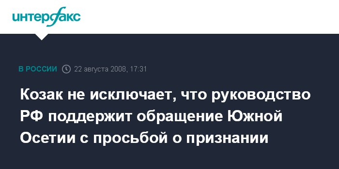 Отвечая в пятницу на вопрос, какой может быть реакция российского руководства на обращение граждан Южной Осетии признать ее самостоятельность, Козак ответил кратко: "Скорее, поддержка".