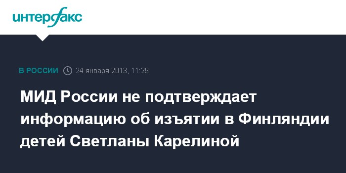 Москва. 24 января. INTERFAX.RU - МИД России не подтверждает изъятие детей российской гражданки Светланы Карелиной в Финляндии социальными службами этой страны.