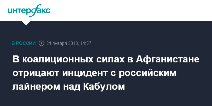 "В настоящее время у нас нет оперативных сведений относительно того, что российский коммерческий пассажирский лайнер был вовлечен в подобный инцидент (над Кабулом - ИФ)", - заявила "Интерфаксу" официальный представитель коалиционных сил лейтенант ВМС США Эмми Хэшн она.
