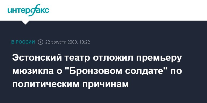 Таллин. 22 августа. INTERFAX.RU - Эстонский музыкальный театр отложил премьеру мюзикла "Бронзовая боль. Welcome to Estonia!" по политическим причинам.
