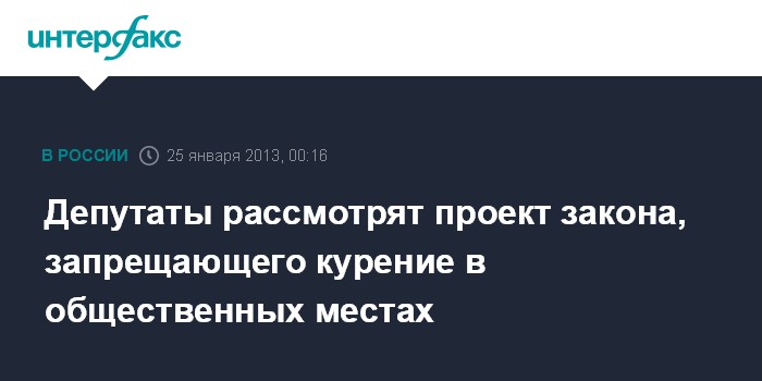 Москва. 25 января. INTERFAX.RU - Госдума в пятницу рассмотрит во втором чтении законопроект, запрещающий курение в общественных местах.