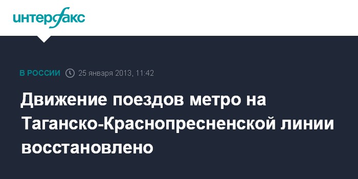 Москва. 25 января. INTERFAX.RU - Движение поездов на Таганско-Краснопресненской линии, прерванное в пятницу утром на станции метро "Октябрьское поле" после падения пассажира под поезд, восстановлено.