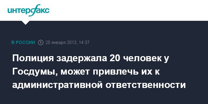 Москва. 25 января. INTERFAX.RU - Сотрудники полиции задержали в пятницу 20 человек за попытку проведения несогласованной акции в центре Москвы, сообщил журналистам представитель пресс-службы столичного главка МВД.