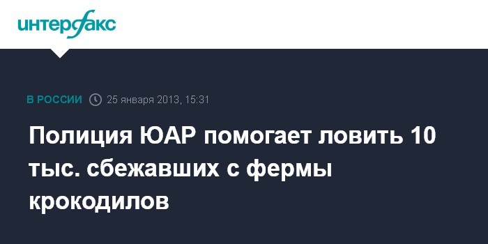 Йоханнесбург. 25 января. INTERFAX.RU - Полицию ЮАР призвали помочь фермерам в отлове 10 тыс. крокодилов, сбежавших накануне с крокодиловой фермы "Раквена" из-за наводнения, сообщил южноафриканский новостной канал "Ньюс 24".
