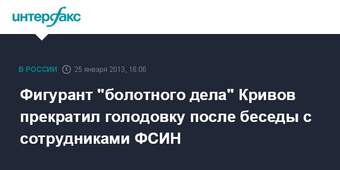 Москва. 25 января. INTERFAX.RU - Фигурант уголовного дела о прошлогодних беспорядках на Болотной площади в Москве Сергей Кривов прекратил голодовку после разъяснительной беседы с сотрудниками СИЗО "Матросская тишина", сообщил официальный представитель столичного управления ФСИН Сергей Цыганков.