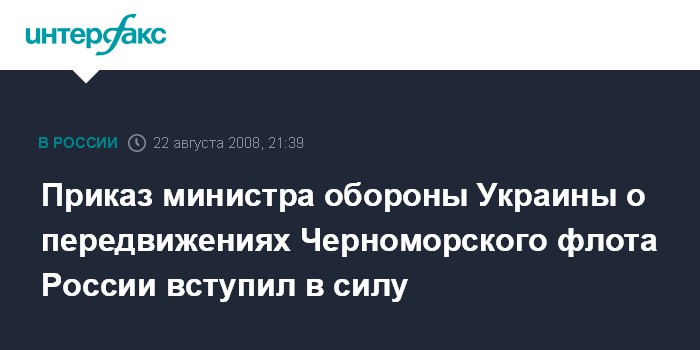 Киев. 22 августа. ИНТЕРФАКС-УКРАИНА - Министерство юстиции Украины зарегистрировало приказ министра обороны от 21 августа "О вопросах передвижений, связанных с деятельностью воинских формирований Черноморского флота Российской Федерации вне мест их дислокации на территории Украины".