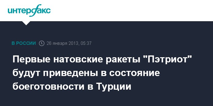 Стамбул. 26 января. ИНТЕРФАКС - Первые ракеты "Пэтриот", которые решено развернуть в Турции, как ожидается, будут приведены в боеготовность в субботу.