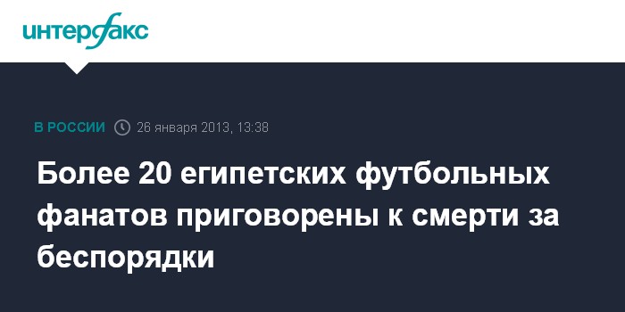 Каир. 26 января. INTERFAX.RU - Египетский суд в субботу вынес смертные приговоры в отношении 21 участника беспорядков, возникших после футбольного матча на стадионе в городе Порт-Саиде. Всего обвинения предъявлены 70 участникам беспорядков.